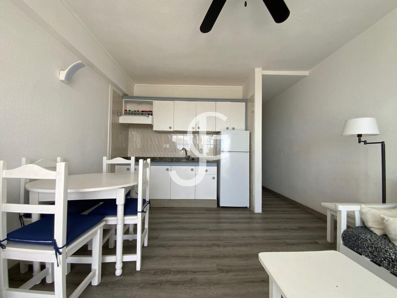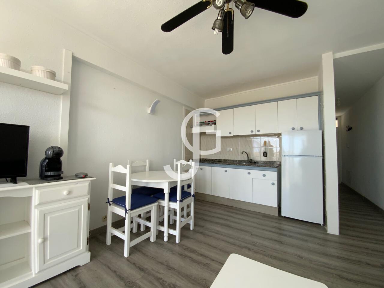 Al entrar, encontrarás la habitación principal con cama doble y un armario con gran capacidad de almacenamiento. Continuando el pasillo, se encuentra un baño equipado. Finalmente, la estancia mas amplia ofrece una cocina abierta al salón-comedor muy luminoso gracias al acceso mediante puertas de cristal al balcón. ¡Desde aquí podrás disfrutar de las mejores vistas!